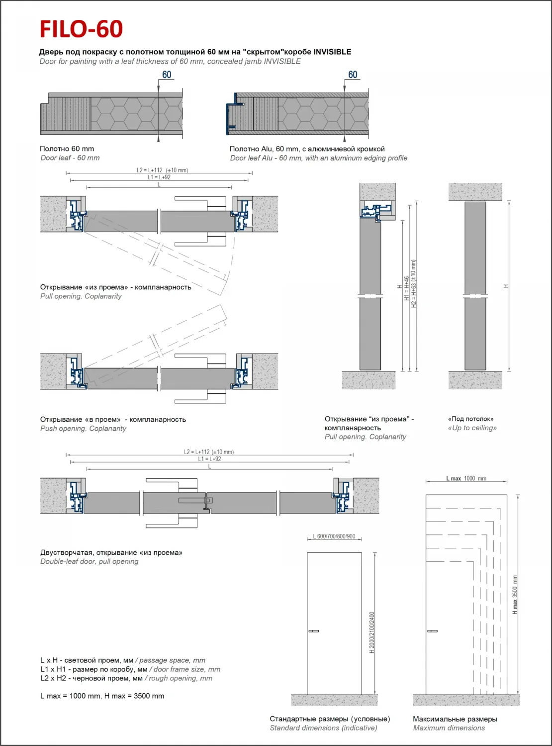 Особенностью двери FILO-60 является анодированный алюминиевый короб и полимерное покрытие дверного полотна, которое выполняет роль грунта для последующей покраски в любой цвет непосредственно на месте. Если дизайн подразумевает оклейку дверного полотна обоями, то в качестве опции предлагается алюминиевая торцевая кромка. Торцевая кромка позволяет наклеивать обои, не опасаясь при этом их отклеивания и задирания краев, обеспечивая дополнительную защиту торца от механических повреждений.
