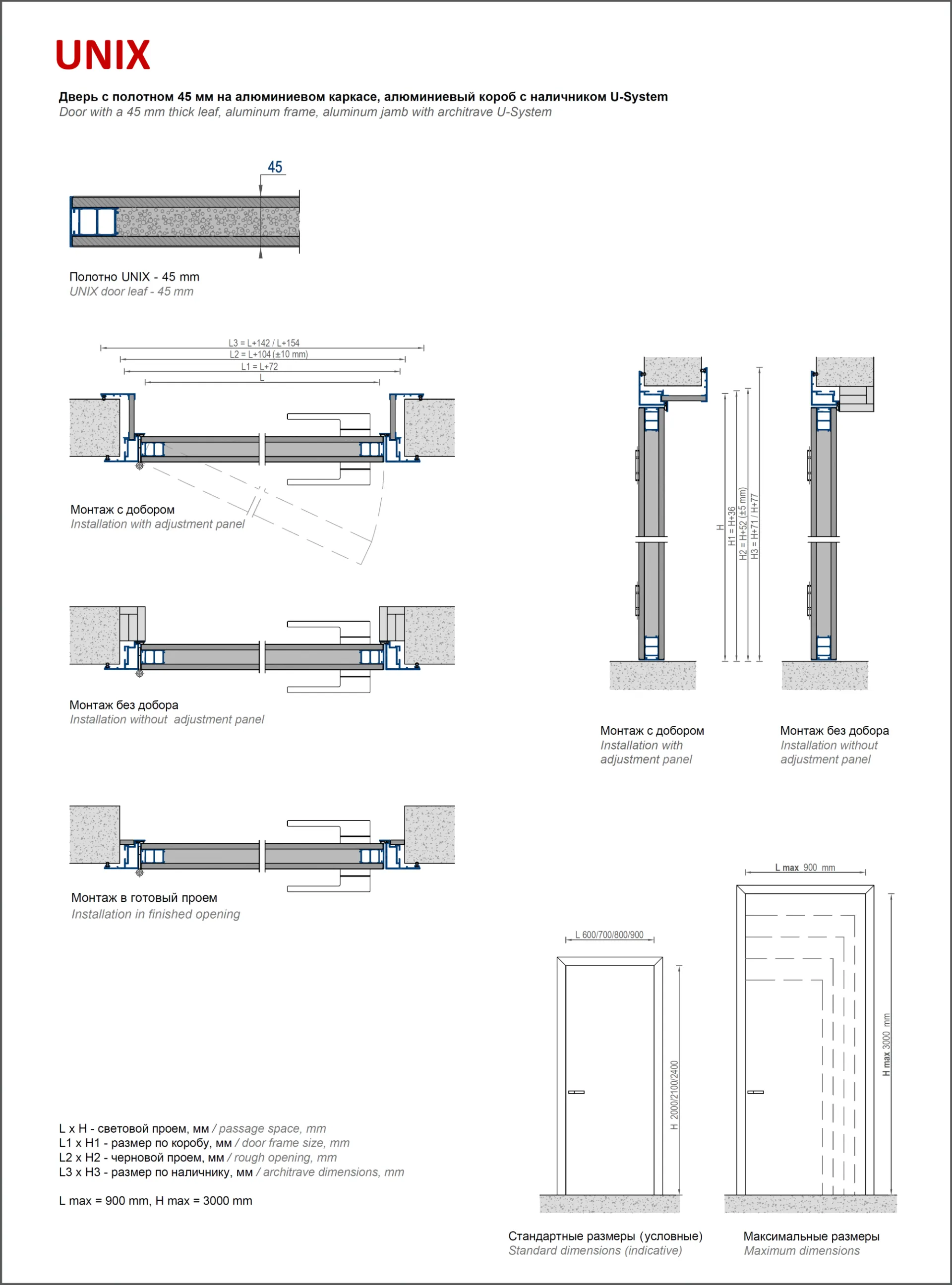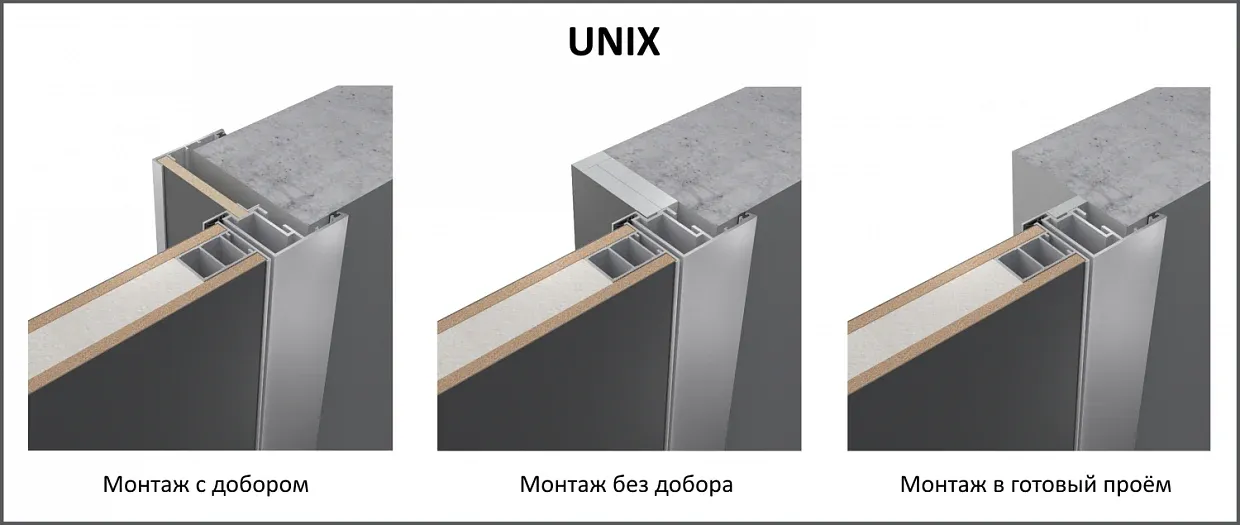 UNIX – экономичный вариант двери в алюминиевом коробе с наличниками. Минималистичный дизайн при широком выборе отделок.